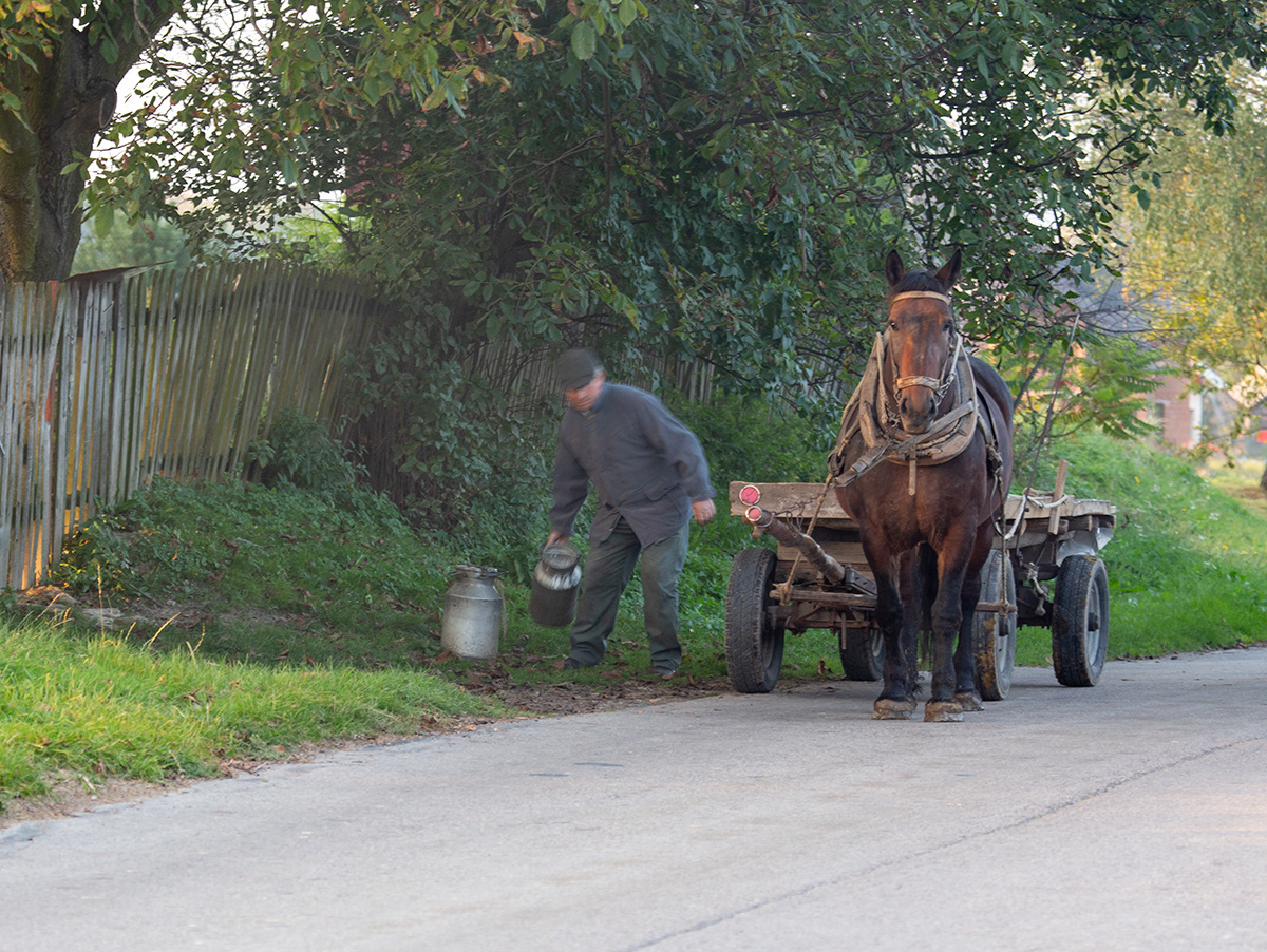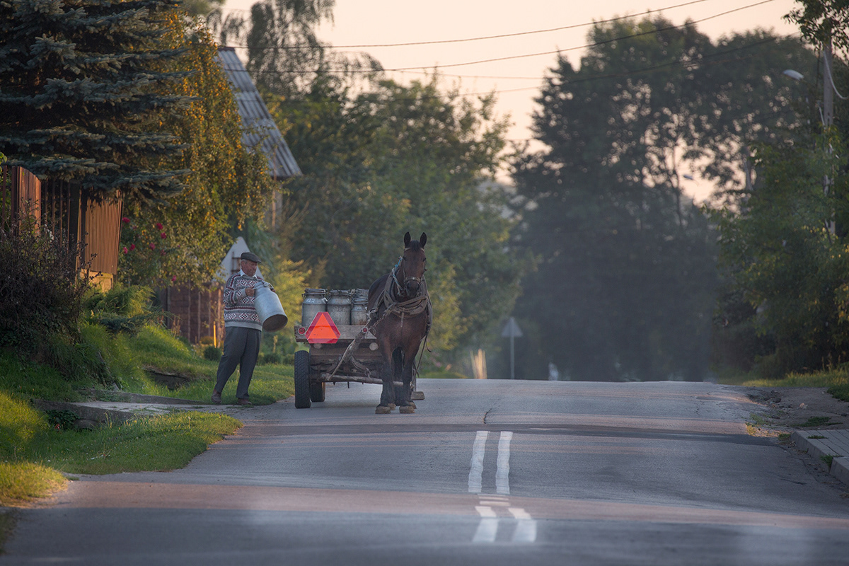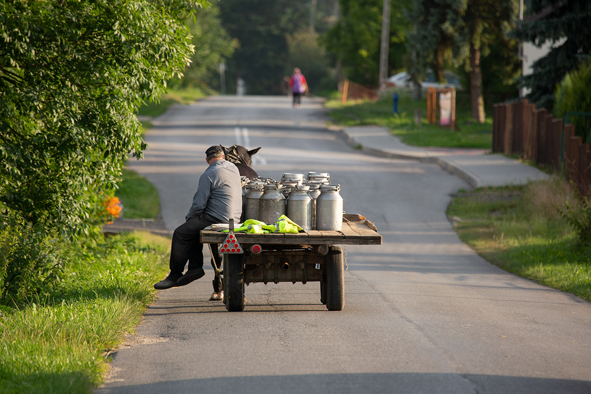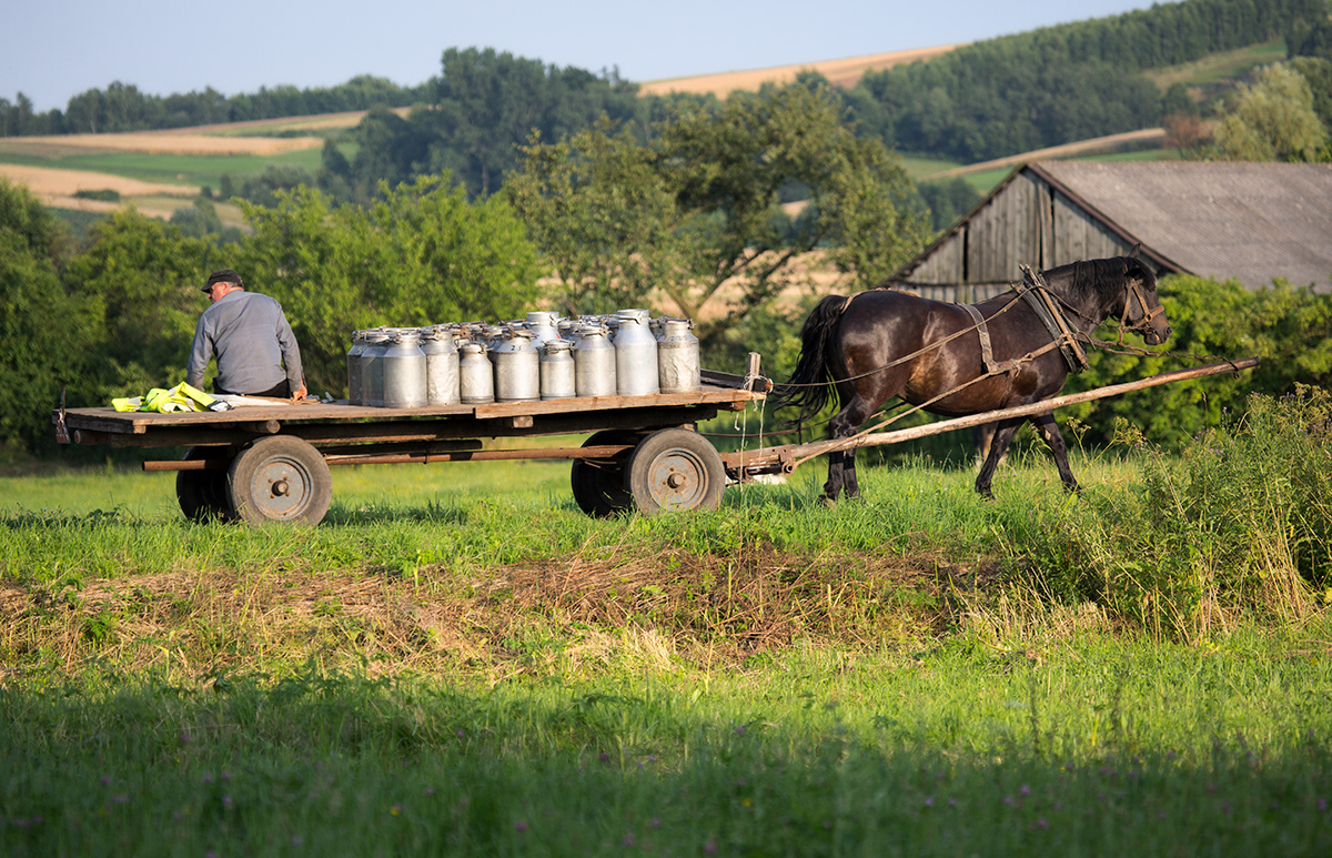 Traditional milk carrying in countryside. Poland.