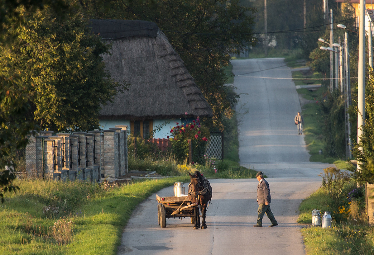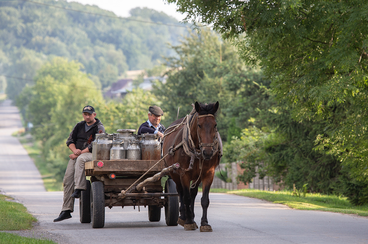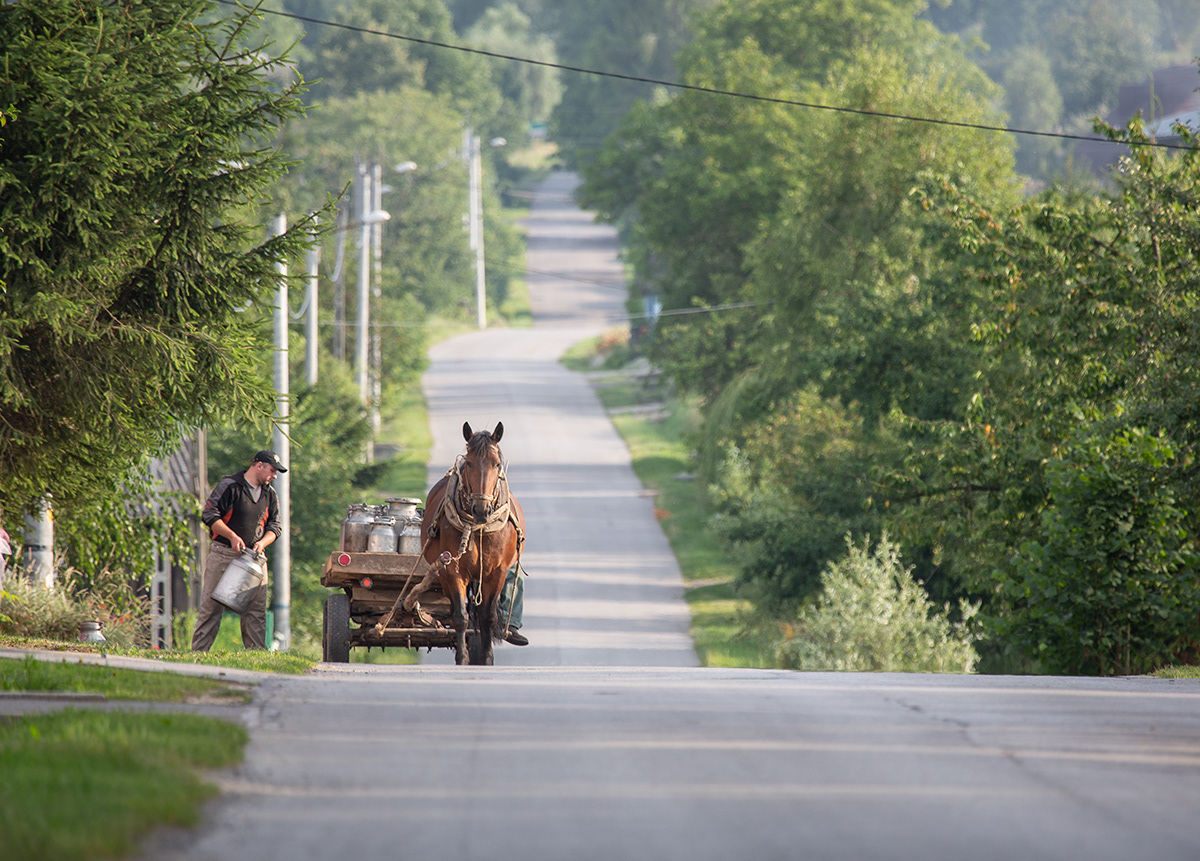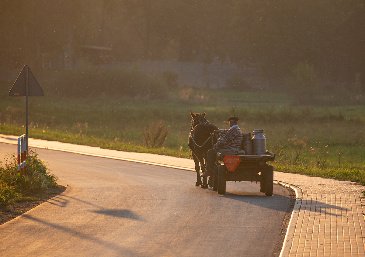 Traditional milk carrying in countryside. Poland.